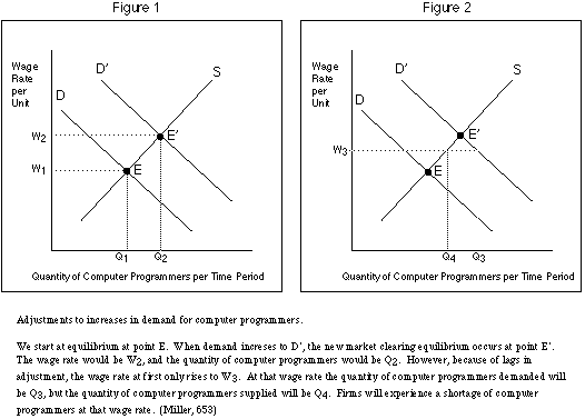There have been shortages of skills before,...[b]ut this is among the worst in a long time....Colleges and universities have failed to train more computer-science students....On top of that, college grads with computer-related degrees are getting scarcer. U.S. colleges and universities awarded about 35,000 degrees in computer science in 1994....This marks a drop of about 15,000 from an all-time high in 1986, according to the National Center of Educational Statistics in Washington. Computer vendors, systems integrators, outsourcers, and consulting firms compete for the same people....[The] talent shortage is in part a result of the success of [the Internet]. (McGee)This has created a shortage of computer scientists which can really only be filled by an untapped resource; the female population. According to theories of economics, "[l]abor markets do not adjust instantaneously. When there is an increase in demand, wage rates do not adjust right away" (Miller 653). This is illustrated in Figure 1 and Figure 2. At the original demand (D) for computer professionals, there was a particular supply (S) and an equilibrium wage rate (W1). The Internet changed the demand to D', and the new wage rate would have been W2. However, it takes time for the market wages to adjust to a new economic situation. Therefore, the wage rate is between the original and the ideal (W3). At this rate, the quantity of programmers demanded will be Q3, but the supply is static or decreasing, and so the quantity supplied will only be Q4. This illustrates the shortage of computer science professionals. This economic event could help to increase the number of women in computer science because universities and firms will have to increase wages, reduce the gender-biased income gap, or provide other economic incentives (free child daycare, parenting leave, or better benefits) to fill the demand, and this would attract more women into the field.